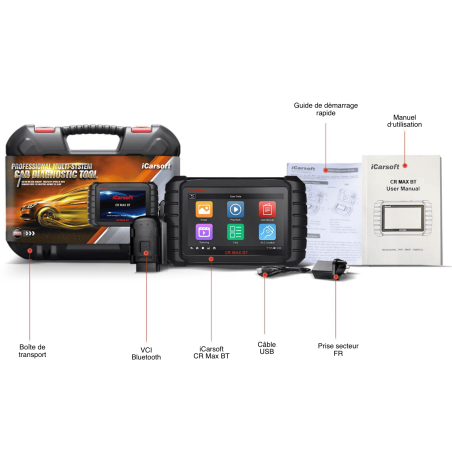 iCarsoft CR Max BT est une valise de diagnostic auto professionnelle multi-marques. Équipée d'un écran tactile de 7 pouces, iCarsoft CR Max BT vous permet un diagnostic tous systèmes + programmations & codages.