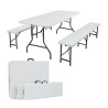 Pratique, solide et facile à installer, cette table pliante accompagnée de ses 2 bancs est l'accessoire indispensable pour vos repas entre amis ou en famille.Que ce soit à la maison, au camping, en ballade, pour un pique-nique ou un mariage, cet ensemble devient vite indispensable et vous suivra partout ! Usage aussi bien intérieur qu'extérieur !Table pliante grande capacité jusqu'à 8 personnes !Dimensions de la table pliante portable 180 CM- Dimensions du plateau : Longueur 180 CM x épaisseur 4 CM- Dimensions repliée : L. 90 x l. 74 x H. 8,5 CM- Plateau en polyéthylène- Tubes : diamètre 25 MM x épaisseur 1 MM- Surface en plastique- Couleur : blanche- Dimensions du banc déplié : L.183 x l. 28 x H.43 CM- Banc avec poignée de transport, totalement pliable- Fermeture et ouverture sécurisée par loquet de verrouillage- Assise : PEHD (polyéthylène haute densité)- Épaisseur de l'assise : 4 CM- Tubes acier diamètre 19 MM - épaisseur 1 MM- Poids maximum supporté : 250 kg