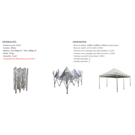 - Barnum déplié : 4,00m x 6,00m x 3,85m (au plus haut)