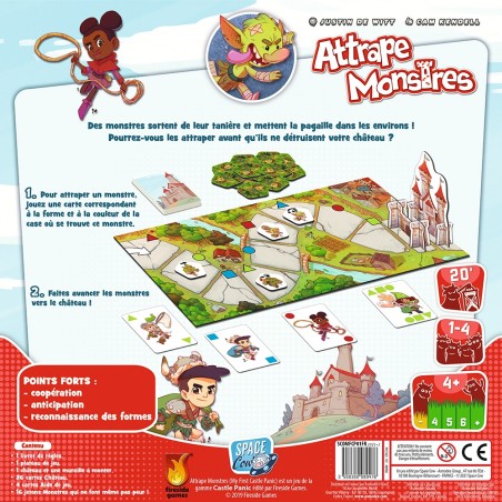 Dans Attrape-Monstres les joueurs jouent tous ensemble afin d’arrêter les monstres avant qu’ils n’atteignent le château. Ce jeu familial coopératif permettra aux jeunes joueurs d’appréhender les formes et les couleurs.
