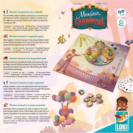 Monsieur Carrousel est un jeu coopératif où vous allez devoir faire monter tous les enfants sur le manège avant que la pluie ne tombe et que Monsieur Carrousel ne ferme son attraction. Tu vas placer les enfants à l’aide du dé. Il faudra bien retenir sur quels sièges les enfants sont installés : Monsieur Carrousel te le demandera au cours de la partie ! Si tu réponds correctement, le soleil brillera mais si tu te trompes, ça fera tomber la pluie !